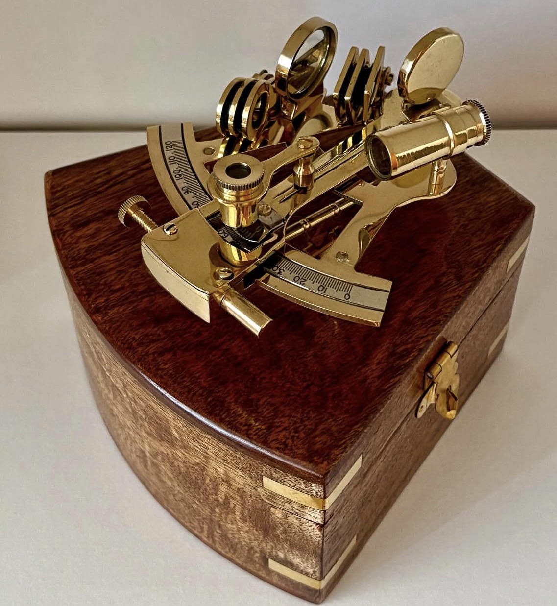 The sextant was designed for maritime navigation to determine the angle between the sun and the horizon. Invented in the 1930s by John Hadley (1682-1744), an English mathematician, and Thomas Godfrey (1704-1749), an American inventor, it quickly replaced the astrolabe and the octant as the principal instrument used for navigation. A sextant is made up of small telescope, to focus on the horizon, two mirrors (reflecting the image of the sighted object), shades (for the sun), a moving arm and a scaled arc. The scale of a sextant has a length of? of a circle (60º), hence the sextant’s name.