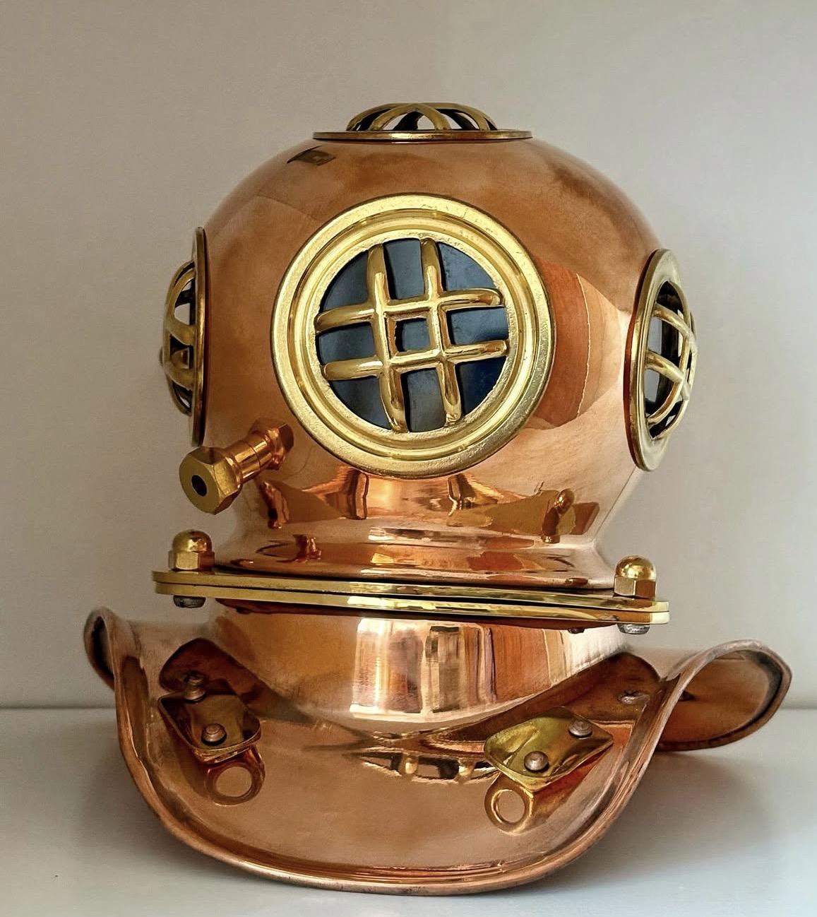 Bronze and brass diving suit with wooden base.
