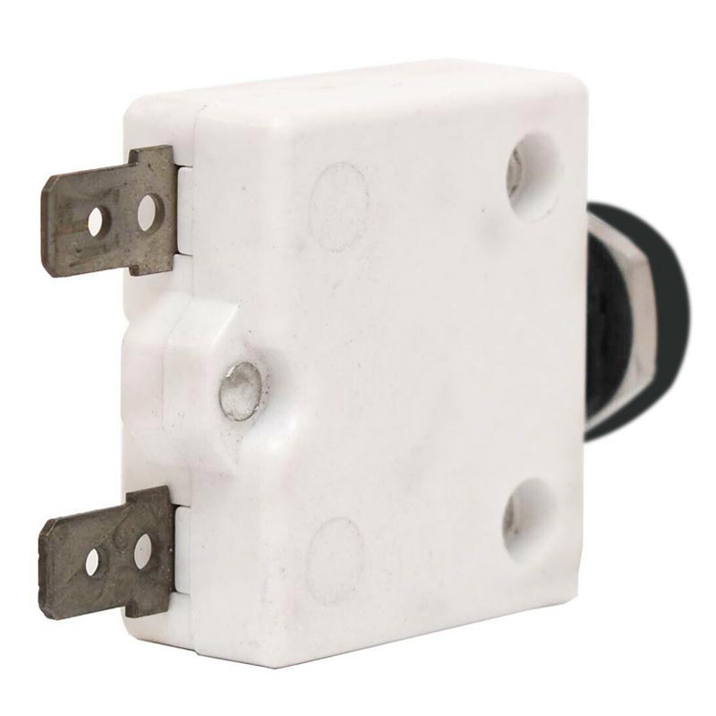 Push To Reset Circuit breaker 50V DC / 250V AC. This push to reset breaker is constructed out of matte white plastic. It is rated for 5A and 50V DC / 250V AC. It mounts via 2x male spades.
