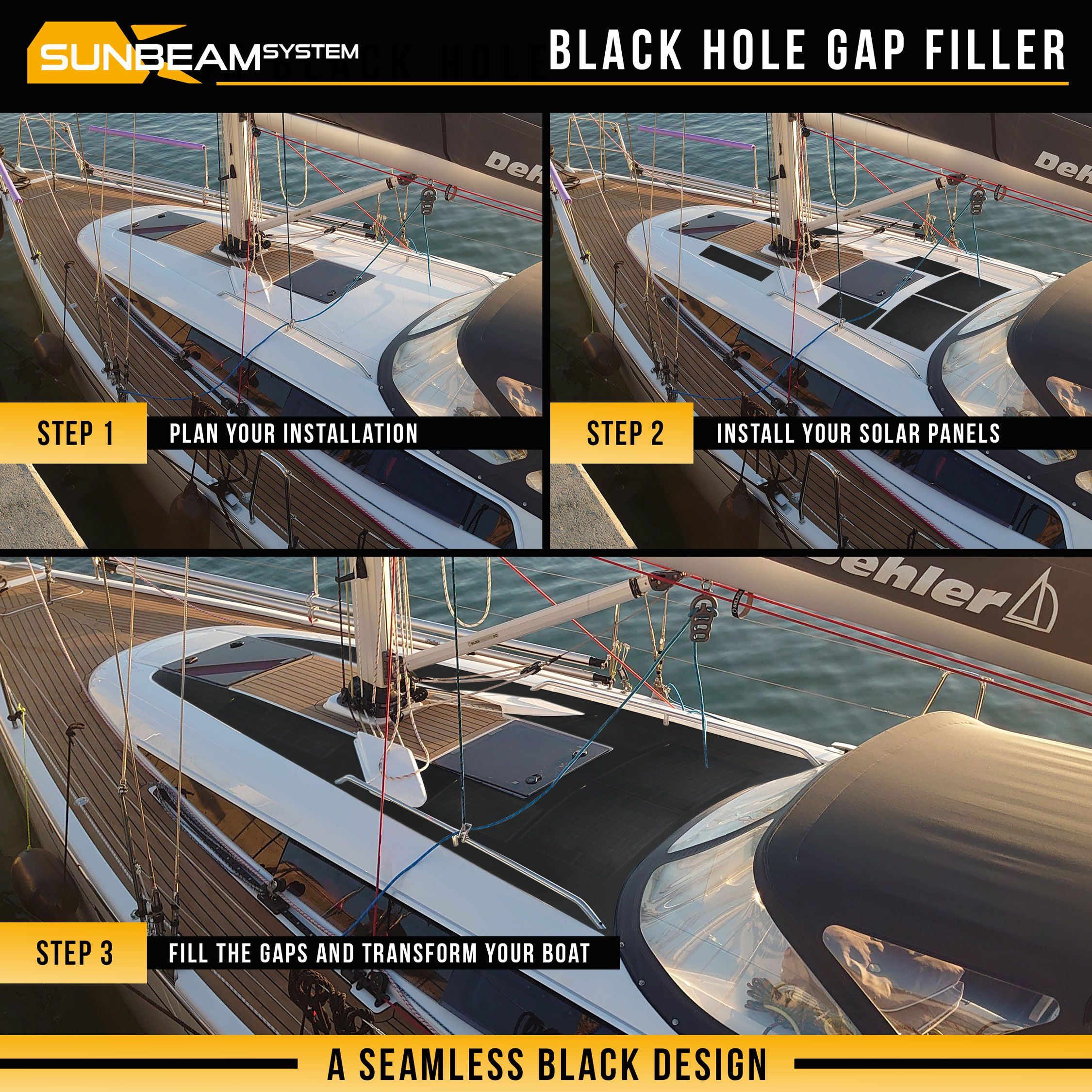 The Tough Black Hole is a Gap Filler complement for the Tough Black solar panels series. In order to achieve the most seamless solar panel installation. By allowing the user to fill any space or difference between solar panels. As a result, it creates a complete all-black surface. The perfect integration of your black solar panels into your yacht or motorhome.